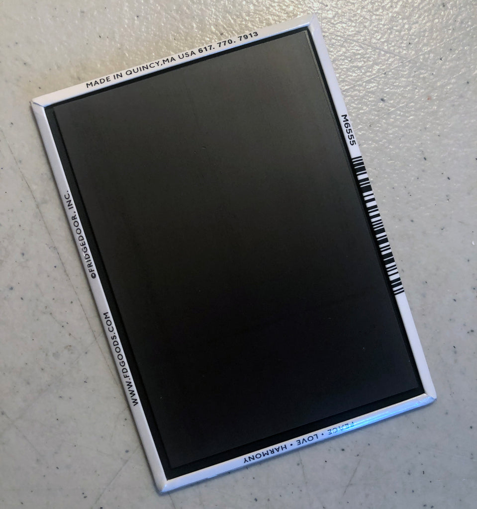 The rigid button style magnet measures 2.5 x 3.5 inches.