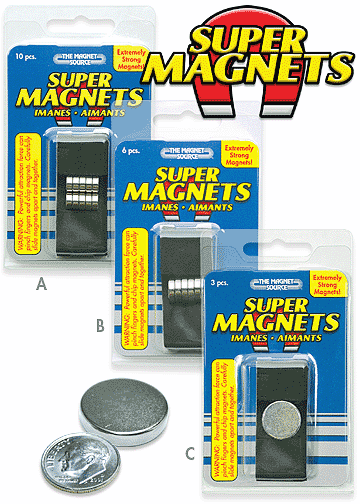 Super Magnets are made of neodymium, the most powerful magnet material in the world! The largest size shown here is only the size of two dimes, but strong enough to hold a 1/4" thick pad of 3" x 3" sticky notes to a metal filing cabinet! Super Magnets are great for projects that require extreme strength in a small size; or simply to amaze friends.
