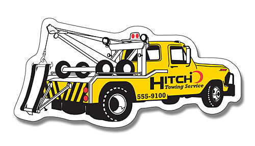 Start with Fridgedoor's stock tow truck shape art and add your image, logo and text at no extra charge. An online proof is included in the pricing. These high quality tow truck shape custom magnets will stick around the fridge, ready for your next emergency call.